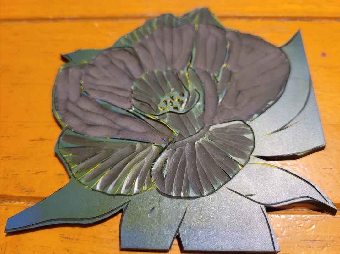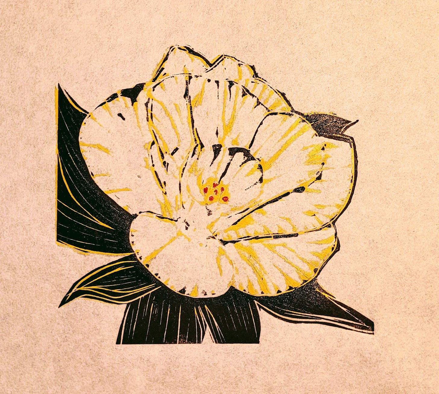 This is my first attempt at this method and I learnt a lot. I think I cut too much away before the first print. I wanted the flower to be White but with the choice of Yellow alongside it I’m not sure if that was a strong enough colour to bring out the texture of the petals as I had expected.